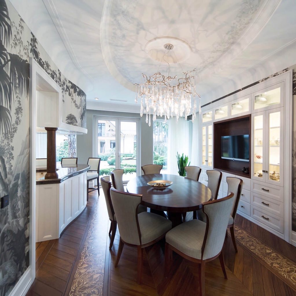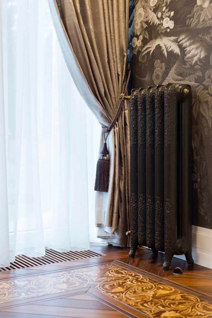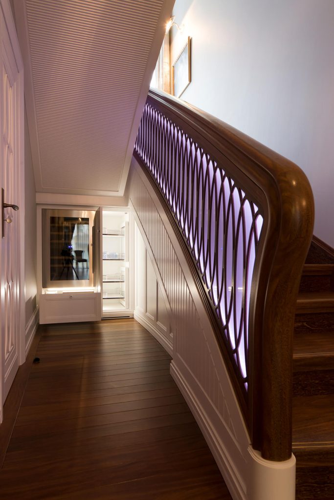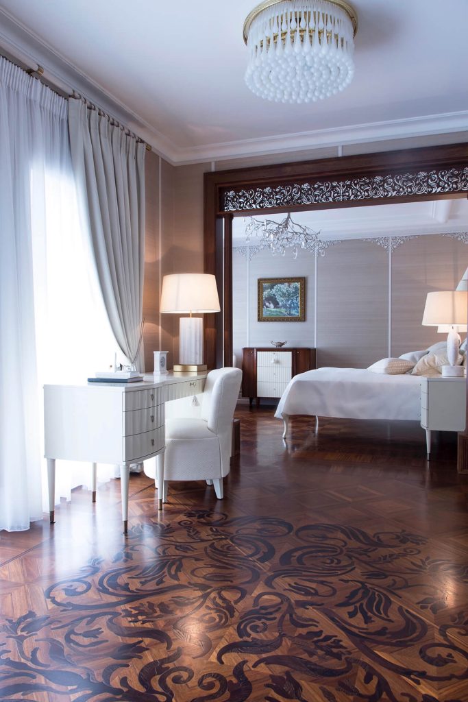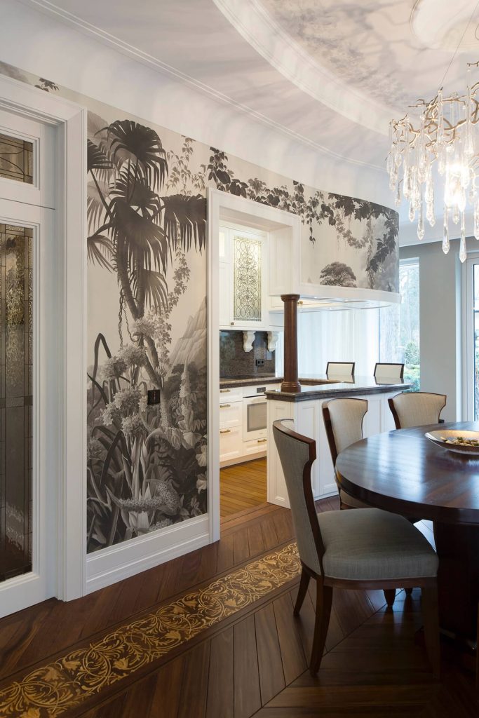 Finishes include custom-designed Sucupira floors by Heritage Parquet, delicate De Gournay wallpapers, Serip lighting, bespoke built-in furniture, and hand-painted ceiling murals adorn the property.