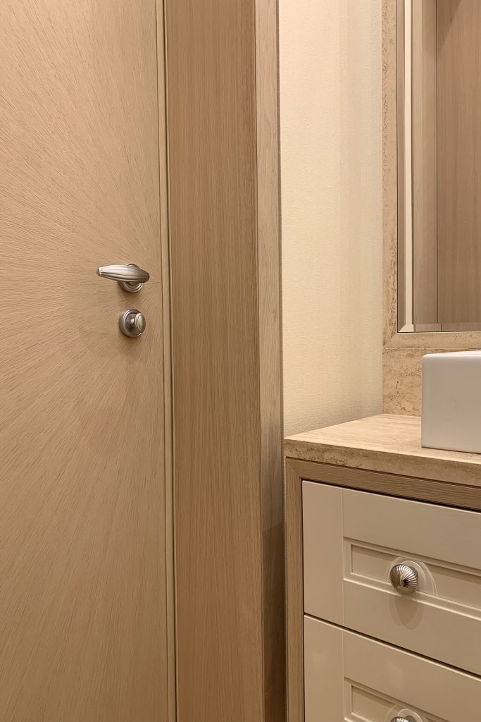 Custom white oak floors and wall panels ground the space in warmth. The highlights include a hand-crafted glass backsplash by AM Studio and lighting by Brand van Egmond. The finishes are kept natural and tonal, while integrated technology enhances comfort without disrupting the aesthetic.